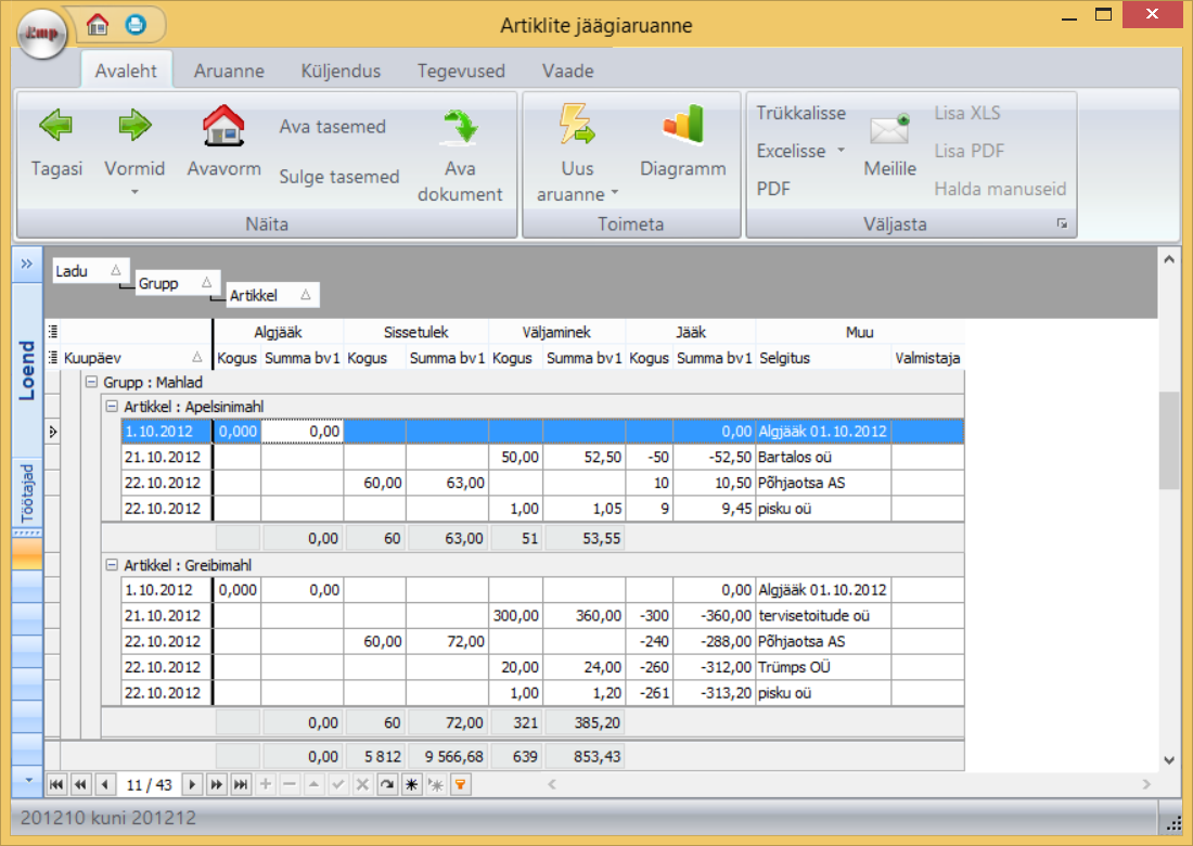 Käibeandmik annab ülevaate artiklite algjääkidest, käibest ja lõppjääkidest rahaliselt ja koguseliselt.