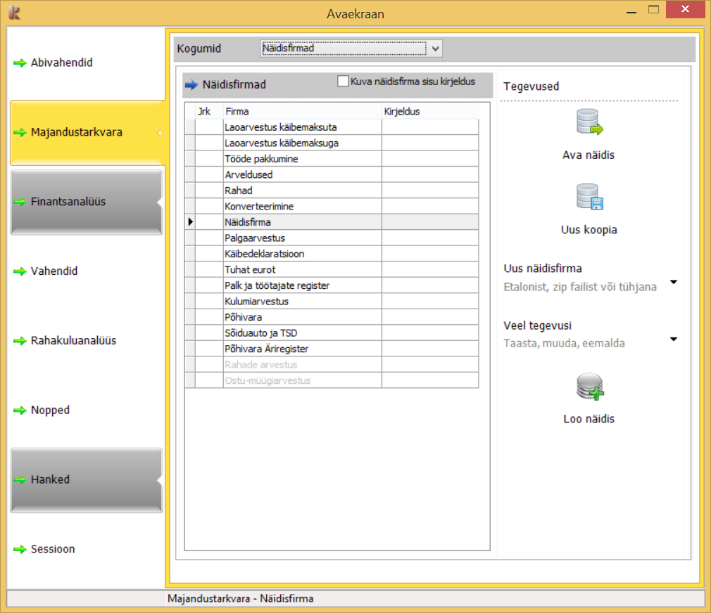 Majandustarkvaras paiknev firmade loend on jaotatud kolmeks kogumiks: tööfirmad, näidised ja etalonid. Valige vajalik kogum ning seejärel liikuge reale mis sisaldab teid huvitavat firmat. Firma kui terviku kohta käivad tegevused on firmade loendist paremal paiknevate nuppude küljes