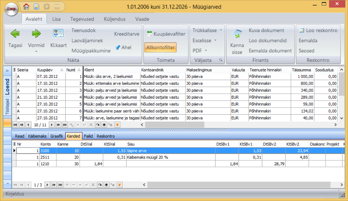 Kõik dokumendilt automaatselt loodud raamatupidamiskanded paiknevad lehel Kanded.