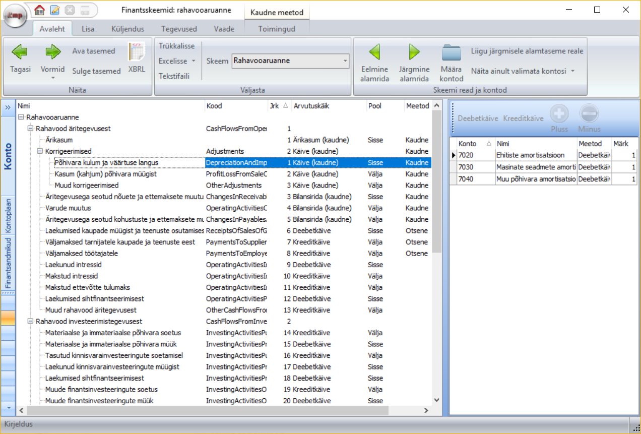 Kaudse meetodi kasutamisel tuleb rahavooaruandega siduda bilanss (bilansiridade muutused) ja kasumiaruanne (ärikasumi rida). Kontode käive võetakse kontode käibeandmikust. Sellest tulenevalt peate kontoplaani nii ülesehitama, et käive, mida ei kajastata rahavoo aruandes, oleks eraldi kontodel.